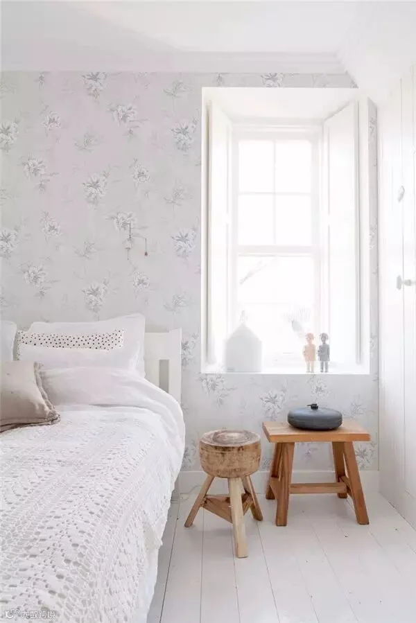 床上用品改为灰色与白色对比的布艺单色即可,带有花朵图案的靠垫只需要零星点缀在床上用来营造温馨的生活氛围。