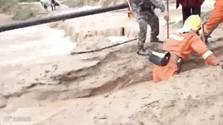 23日,甘肃兰州永登县平岘村遭暴雨袭击,村民被洪水围困。兰州新区公安消防支队特勤中队赶到现场撤离群众时,唯一的撤离路线被洪沟拦住,一名患有心脏病且行动不便的老人无法渡过。