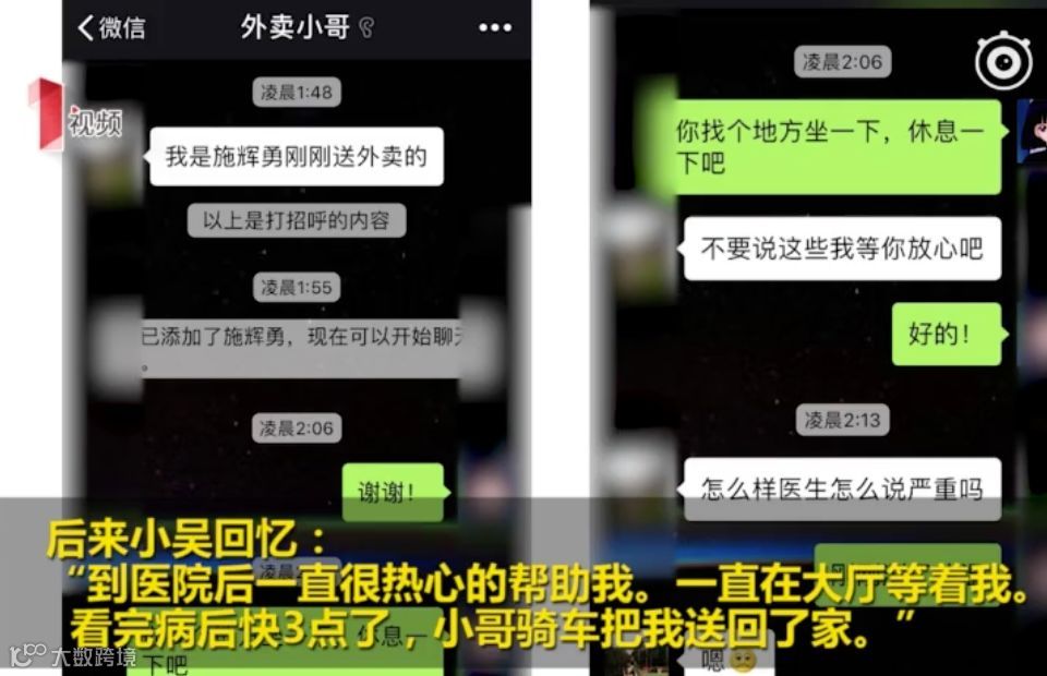22日晚,独自在家的成都女孩小吴突发高烧。凌晨,她点了外卖并备注:餐送给外卖小哥,望顺路帮买退烧药。外卖小哥施辉勇接单后,沿途跑了10多公里买药,可药店都已关门。最后他赶到小吴家,送其就医,直至凌晨3点多……