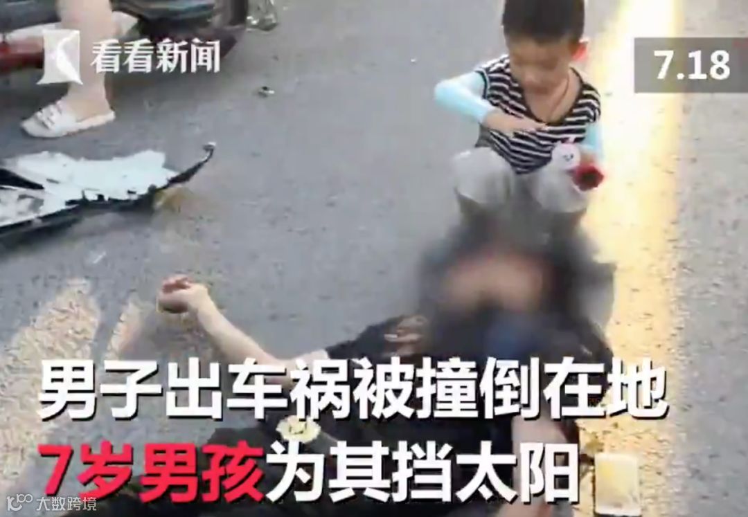 18日,江苏扬州一轿车在左转时与一摩托车相撞,摩托车上两名男子被撞飞出数米远,倒在路上。人群中,一名7岁小男孩走到一伤者身边,用自己小小的身体为伤者遮挡太阳,孩子的母亲则拨打120求助,母子两人直到120救护人员赶到才离去。