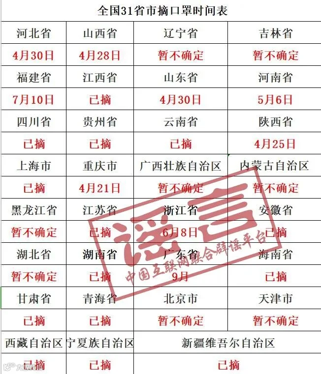 至此,真相水落石出,“全国31省市摘口罩时间表”是谣言!