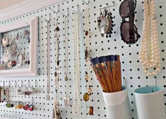 你看,像这样一面饰品收纳墙看起来是不是赏心悦目多了呢!取用方便,再也不会出现大清早急慌慌地寻找一只耳环的事情了吧~早上梳妆心情都美美哒~