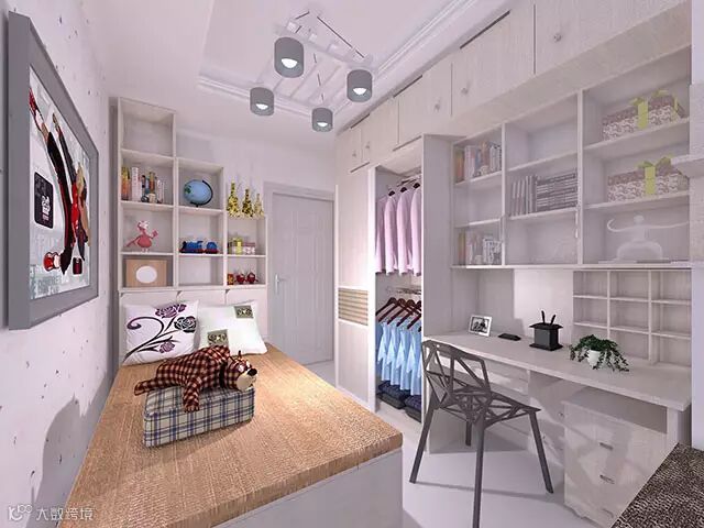 书房与卧室合体,组合柜与到顶衣柜环绕在窗的周围,中间留出一个小飘窗,在视觉上延伸了空间。