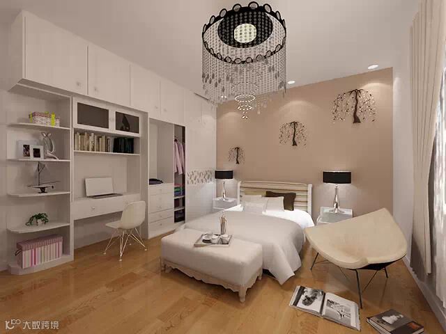 半开组合柜与到顶衣柜“劈”出一个书桌书柜,扩大了卧室的空间。墙面的树形装饰与垂珠行吊灯增添了朦胧感与自然气息。