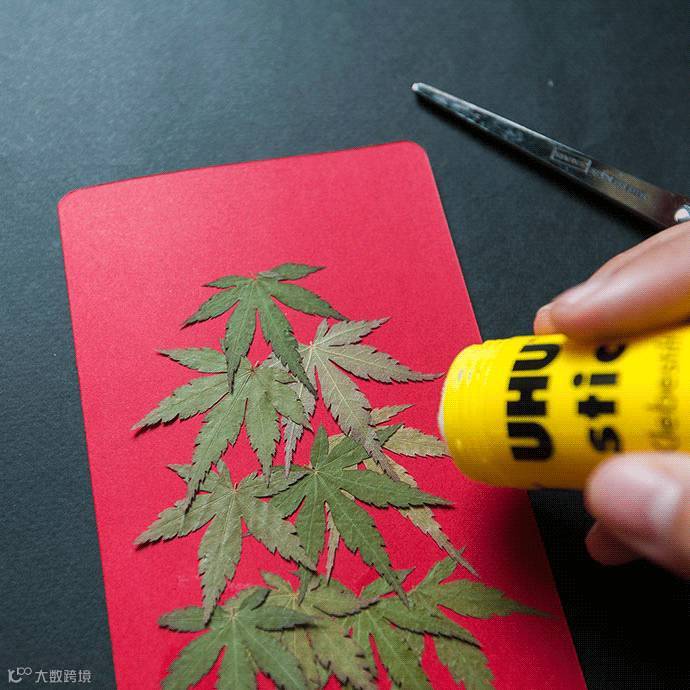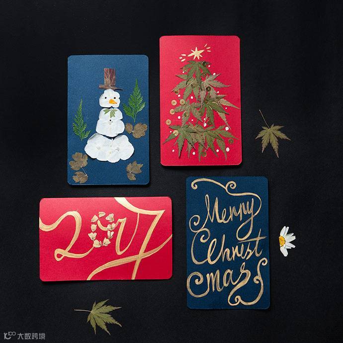 和雪人先生的材料大同小异,只是押花选择了绿色细叶鸡爪槭,卡纸也选用了典型圣诞红色,以及一些亮片作点缀。