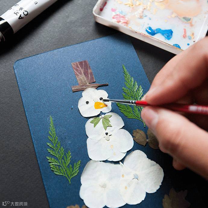 再来可以利用橘色小花瓣作雪人的萝卜鼻子,褐色叶子剪成长方形作帽子,绿叶也能作雪人的蝴蝶结领带。最后用黑色丙烯颜料涂上眼睛和纽扣即可。