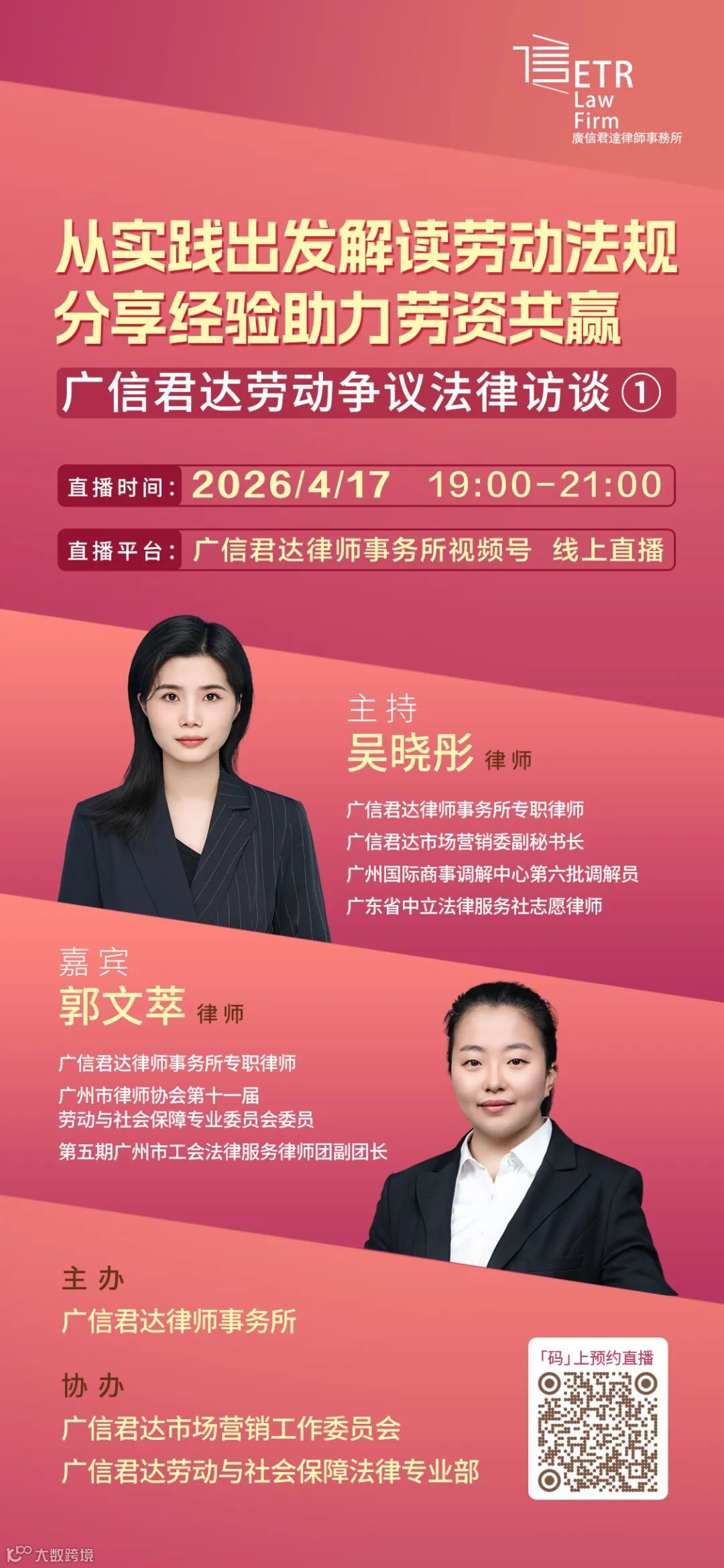 为回应这些现实关切,2026年4月17日,广信君达律师事务所特别推出“从实践出发解读劳动法规,分享经验助力劳资共赢”劳动争议法律访谈①,劳动法律师做客直播间为广大观众答疑解惑,帮助劳动者明晰权利边界,助力创业者构建合规用工体系,用专业法律知识为劳动者、创业者保驾护航。