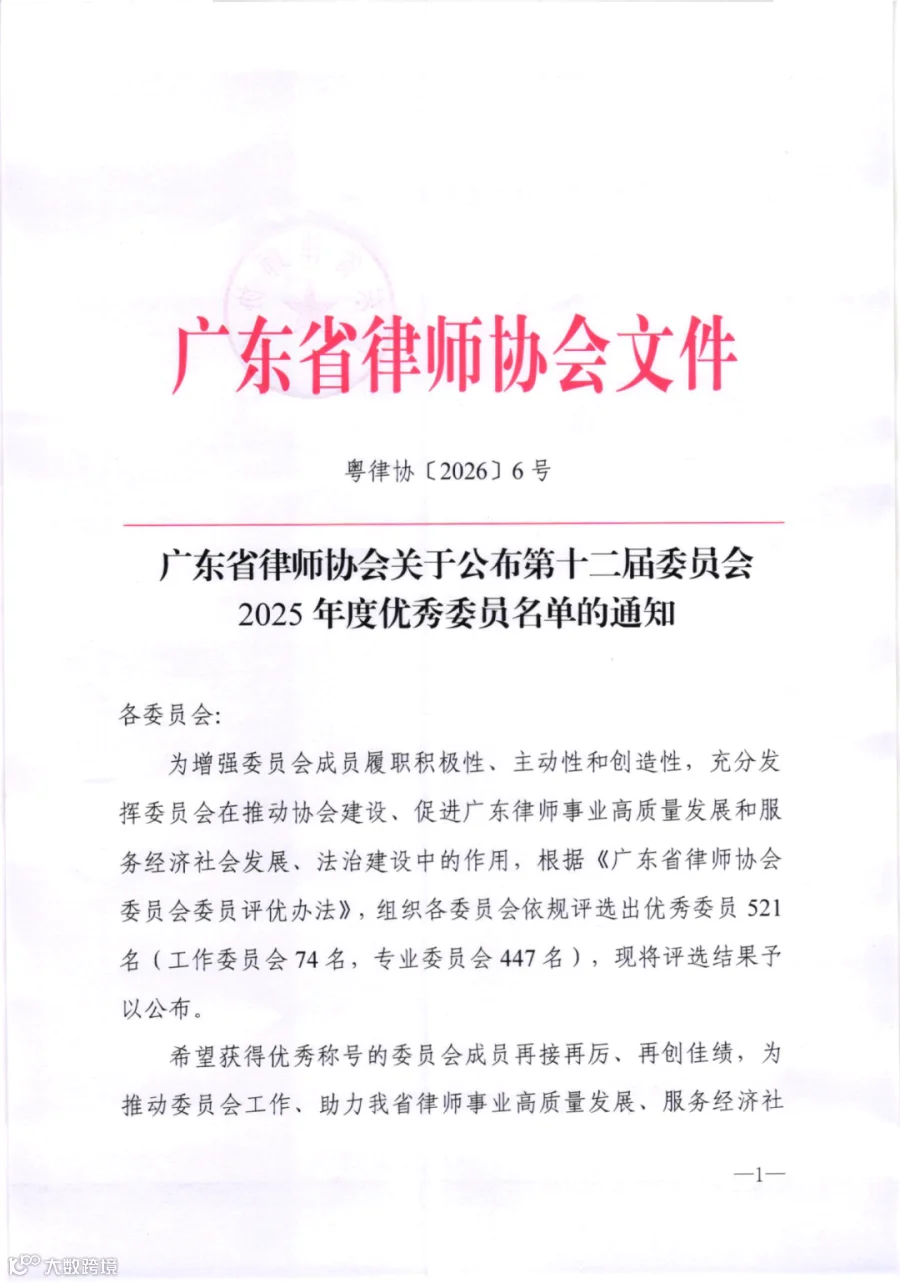 荣誉 | 广信君达18名律师获评第十二届广东省律协委员会2025年度优秀委员