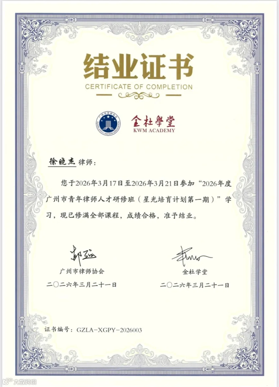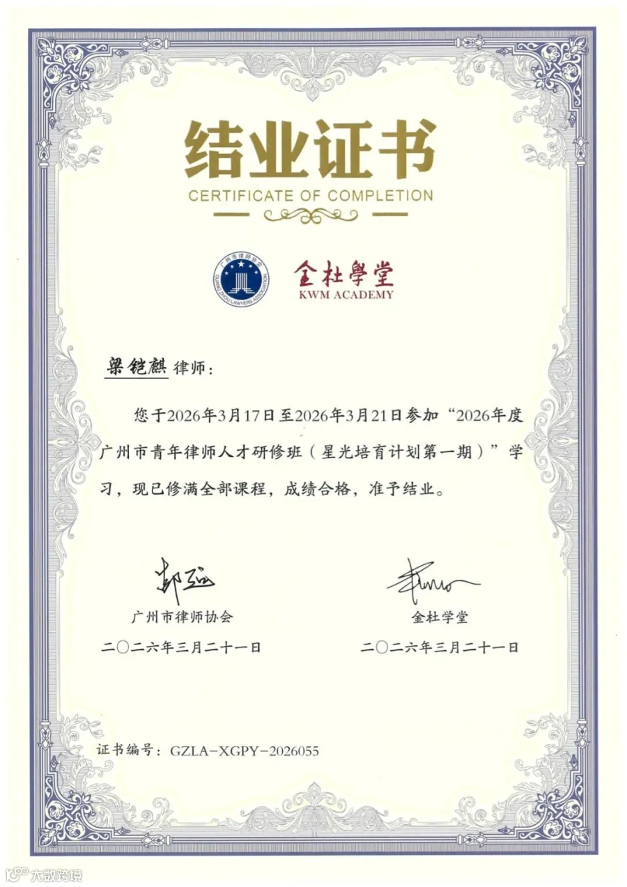 本所合伙人梁铠麒律师及徐晓杰律师参加广州市青年律师人才研修班并结业。