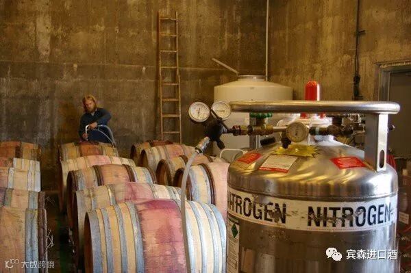 27、通常来说,在熟成过程中,需要把葡萄酒从一个橡木桶转移到另一个,或者从橡木桶转移到不锈钢罐中。下图展示了工人使用氮气来转移葡萄酒,尽量避免葡萄酒与氧气过度接触。