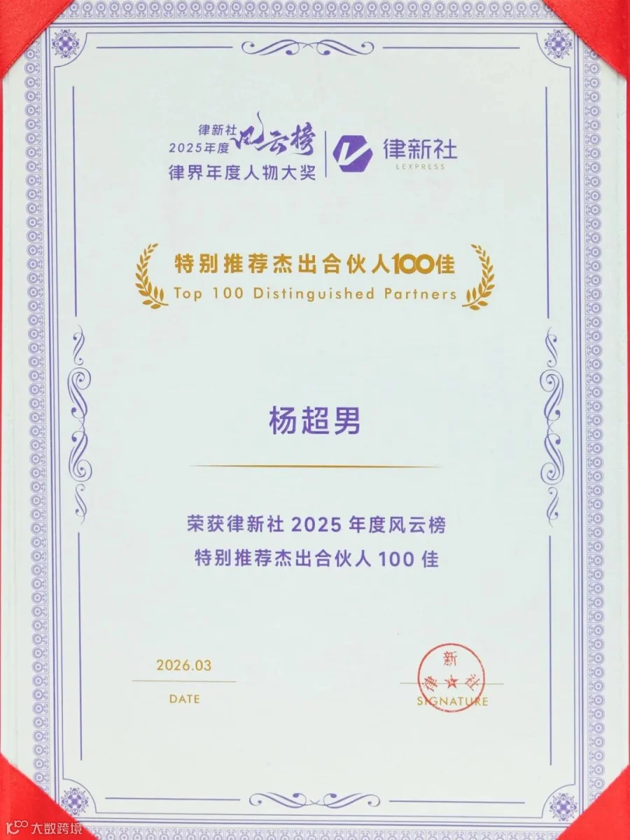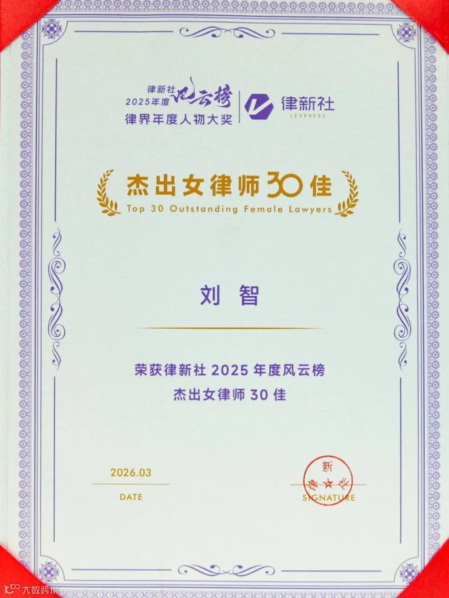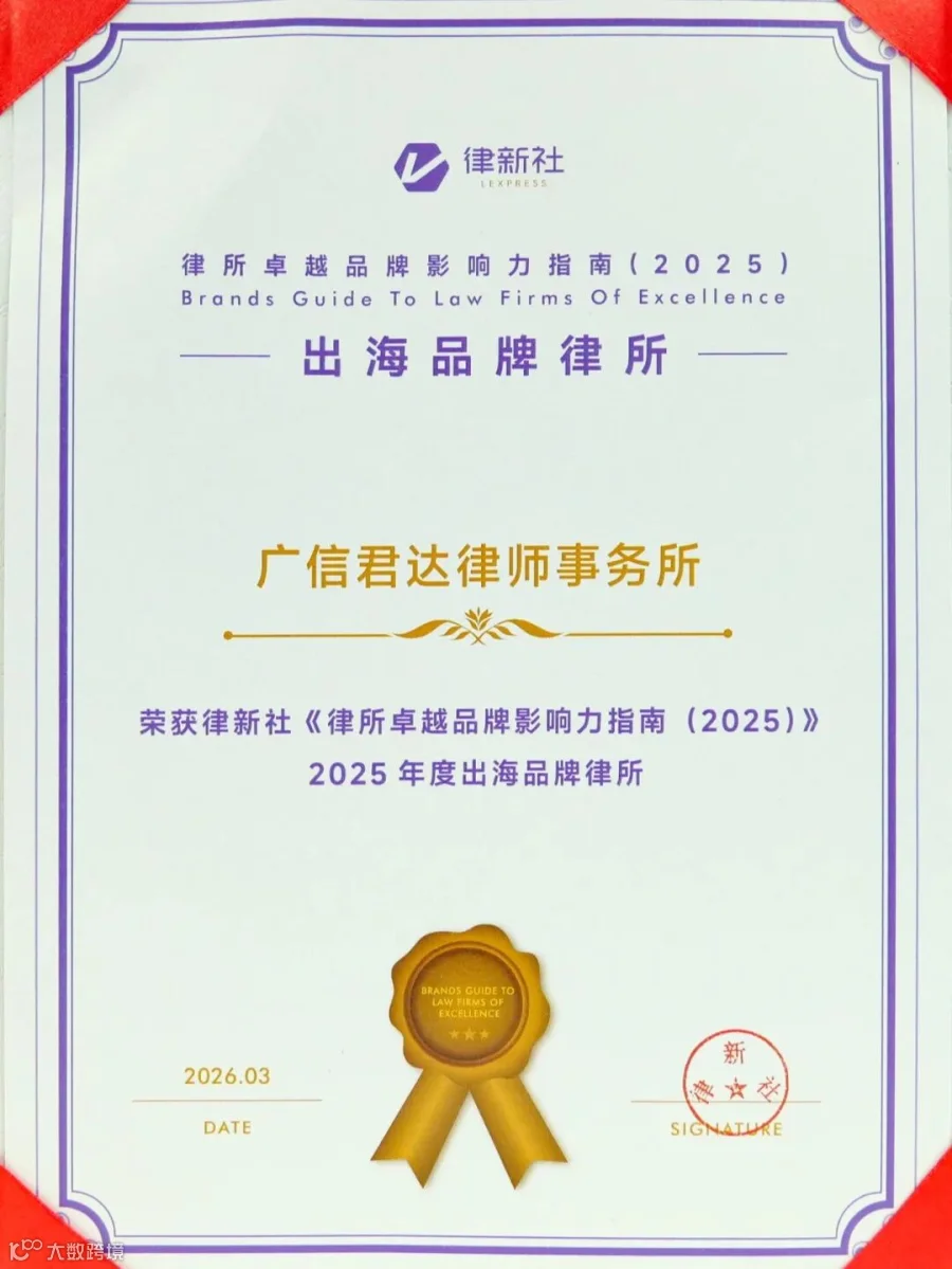 凭借在专业建设、社会责任及国际化布局等方面的综合表现,广信君达律师事务所荣膺“卓越品牌影响力律所100佳”“杰出社会责任品牌律所”“出海品牌律所”三项大奖,本所高级合伙人刘智律师荣获“杰出女律师30佳”,合伙人杨超男律师荣获“特别推荐杰出合伙人100佳”。