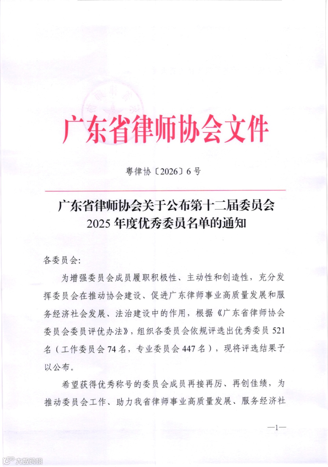 为增强委员会成员履职积极性、主动性、创造性,充分发挥委员会在推动协会建设、促进广东律师事业高质量发展和服务经济社会发展、法治建设中的作用,广东省律师协会公布第十二届委员会2025年度优秀委员名单,广信君达律师事务所3名律师获评工作委优秀委员,15名律师获评专业委优秀委员。