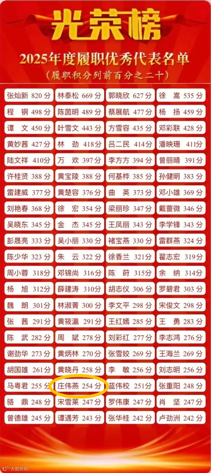 2025年以来,庄伟燕律师继续保持履职热情与实效,全年履职积分达254分,在广州市540多名市人大代表中名列前茅,再次获评定为优秀等级,并荣获“2025年度履职优秀代表”称号。