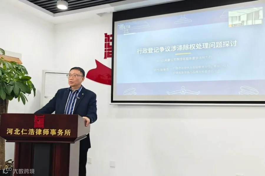 广信君达合伙人会议联席主任、全球理事会副理事长、全球业务市场与品牌发展委员会主任苏东海律师的演讲主题是“行政登记争议涉涤除权处理问题探讨——以夫妻公司等挂名股东要求涤除为例”,他结合广信君达君行团队近年来受理的协助市场监管部门撤销的虚假公司登记法律服务专项进行分析,指出夫妻公司挂名一方要求行使涤除权的,需要从两个维度审查:一、要正确区分冒名登记与挂名(借名)登记的区别,二、夫妻同为公司股东的,一般默示推定同意,除非有相反证据,且要较为充分方可。苏律师还列举了团队承办的部分案例进行深入分析,讲解了最高人民法院关于公司行政登记涤除权处理入库案例的裁判要旨,让大家有更具体的了解。