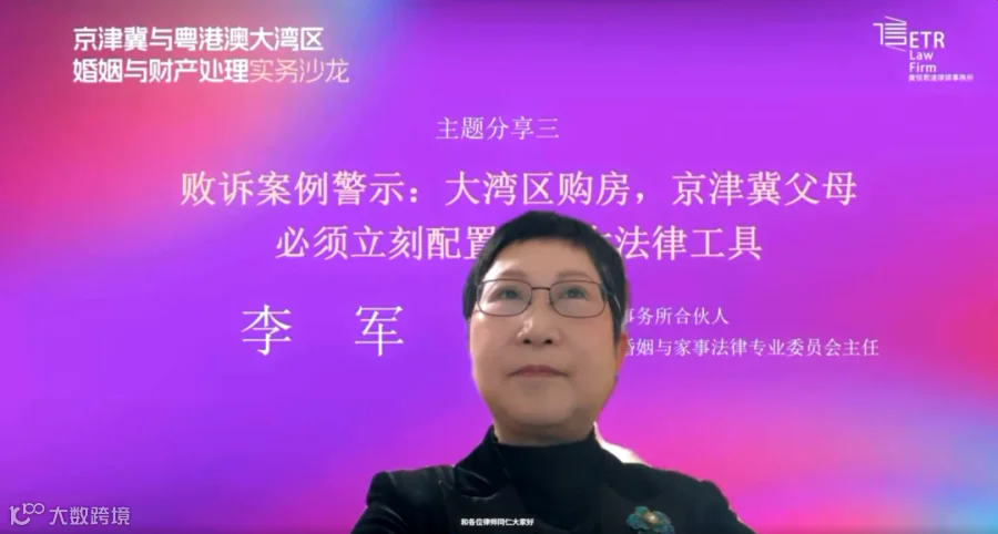 北京市东卫律师事务所合伙人李军律师在“败诉案例警示:湾区购房,京津冀父母必须立刻配置的三大法律工具”分享中,通过典型案例分析,强调父母为子女在粤港澳大湾区购置房产过程中,若仅凭家庭内部习惯进行资金流转而未通过书面形式明确款项性质,一旦在子女产生离婚纠纷时,极易被认定为夫妻共同财产予以分割,她据此提出具有针对性的操作指引,为守护客户财产安全提前布局。