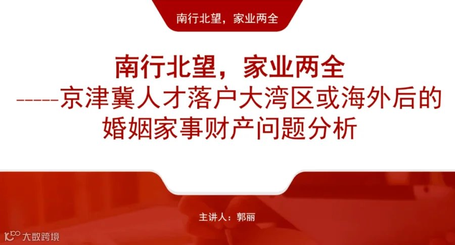 郭丽律师以“京津冀人才落户大湾区或海外后的婚姻家事财产问题分析”为题,从人才流动的特点与政策背景入手,深入剖析在全球化与区域协同发展双重背景下,高净值、高流动家庭所面临的特殊挑战。她指出,此类家庭往往身处“一国两制三法系”乃至国际法律体系的交叉地带,身份与财产、情感与规则、境内与境外等关系交织,形成复杂的系统性风险,并强调此类家庭进行财产处理的前瞻性、结构性和必要性。郭丽律师通过列举实例,进一步指出婚姻家事财产处理已不仅是停留在过去传统的家事范畴,而是综合了民商事、行政法,甚至是刑法等多种法律关系交织于一起的服务领域,需要律师运用多维度的思维观察与思考。