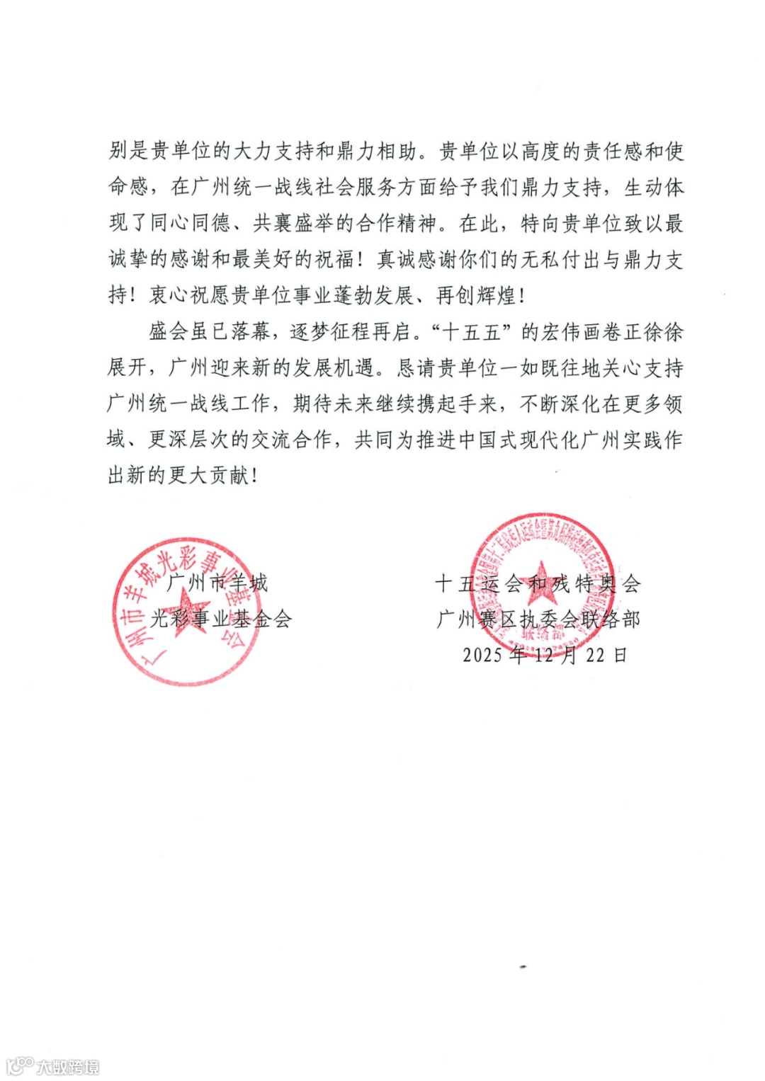 近日,广信君达(白云)律师事务所收到广州市羊城光彩事业基金会、十五运会和残特奥会广州赛区执委会联络部联合发来的感谢信。信中对广信君达白云分所在重大赛事保障、支持广州统一战线社会服务方面的工作给予高度认可和诚挚感谢。