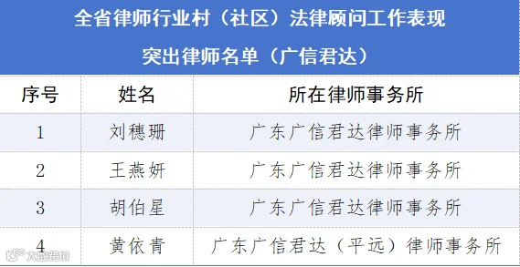 广东省律师协会发布《关于通报表扬全省律师行业村(社区)法律顾问工作表现突出律师的决定》,本所刘穗珊、王燕妍、胡伯星以及平远分所黄依青律师荣获通报表扬。