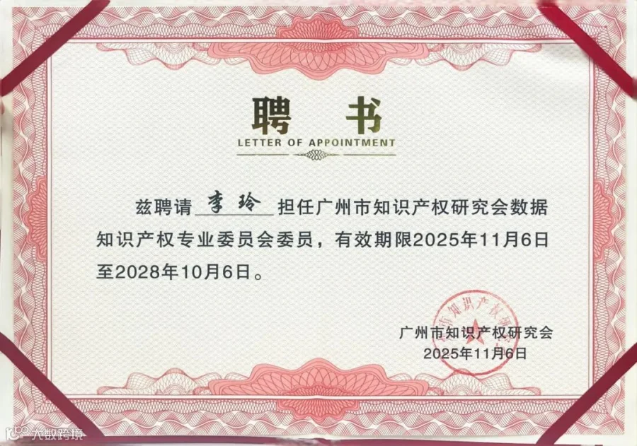 本所李玲律师获聘为广州市知识产权研究会数据知识产权专业委员会委员。