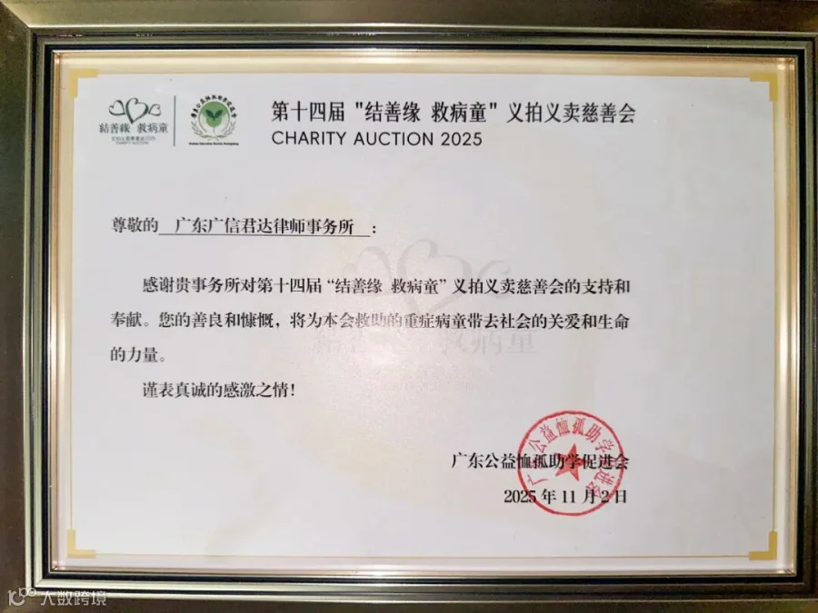 由广东公益恤孤助学促进会倾力主办的第十四届“结善缘 救病童”义拍义卖慈善会顺利举行,本所作为法律服务支持单位,为活动提供了专业的法律服务,本所及黄丽芬律师获颁感谢状。