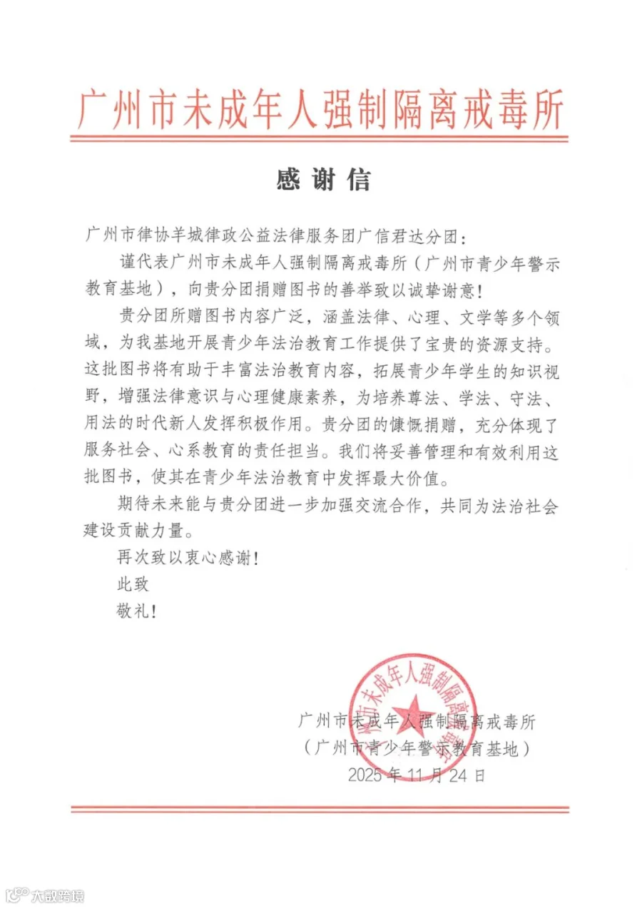 广州市未成年人强制隔离戒毒所(广州市青少年警示教育基地)向本所发来感谢信,并对广州市律师协会羊城律政公益法律服务团广信君达分团在“书香润童心·法治伴成长”公益捐书活动中的善举致以诚挚谢意。