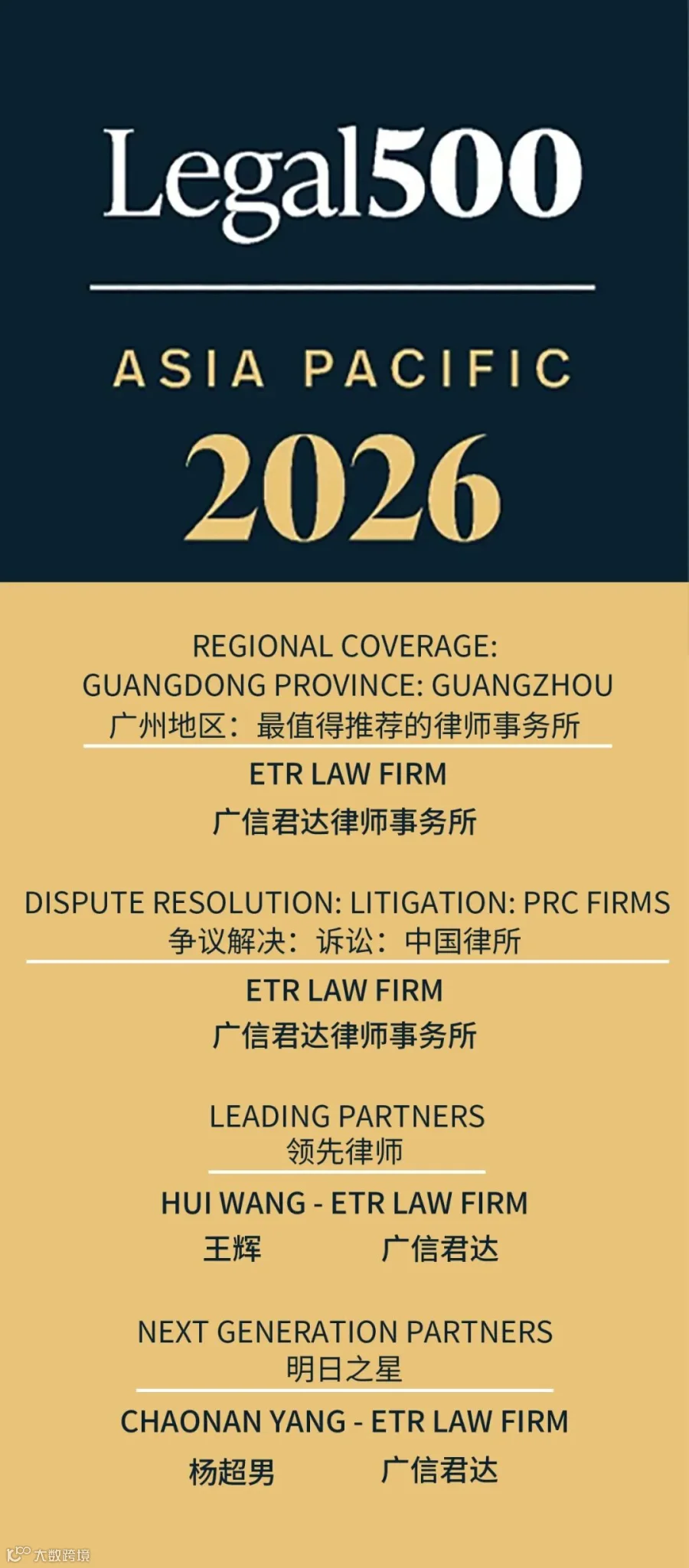 本所入选The Legal 500 2026亚太地区大中华区“争议解决:诉讼:中国律所”“广州地区:最值得推荐的律师事务所”榜单;本所高级合伙人王辉律师获评广州地区“领先律师”,合伙人杨超男律师被评为广州地区“明日之星”。