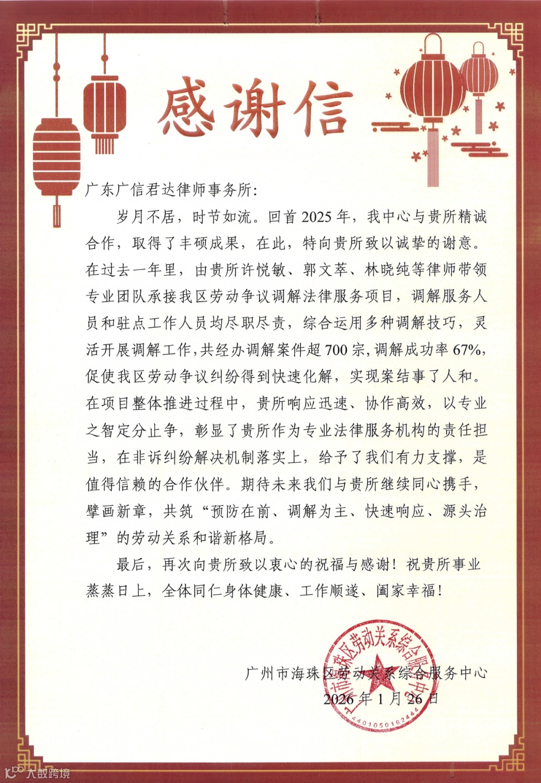 近日,广信君达律师事务所收到来自广州市海珠区劳动关系综合服务中心的感谢信,信中对广信君达在2025年度精诚合作、高效履职,积极参与并圆满完成海珠区劳动争议调解法律服务项目工作给予了高度评价和诚挚感谢。