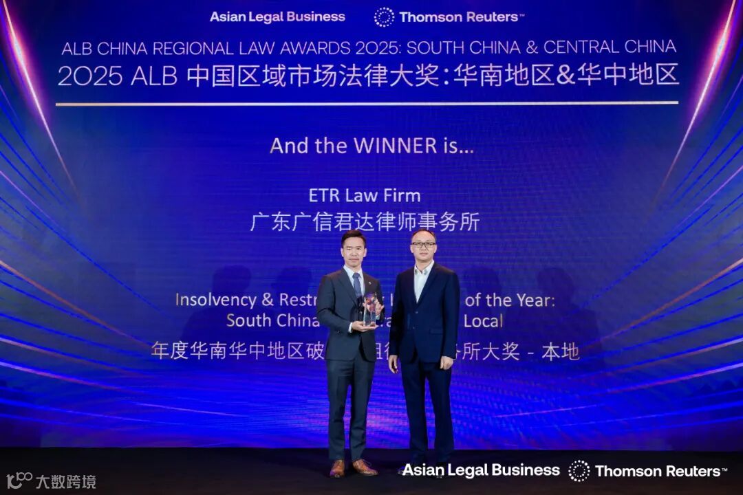 12月5日,2025 ALB中国区域市场法律大奖:华南地区&华中地区颁奖典礼在深圳举行,广信君达律师事务所荣获“年度华南华中地区海外业务律师事务所大奖”“年度华南华中地区破产重组律师事务所大奖”“年度华南华中地区争议解决律师事务所大奖”三项荣誉奖项。本所管委会主任、高级合伙人肖硕彬律师,管委会联席主任、合伙人杨超男律师,高级合伙人王辉、梁沐周律师现场参会。