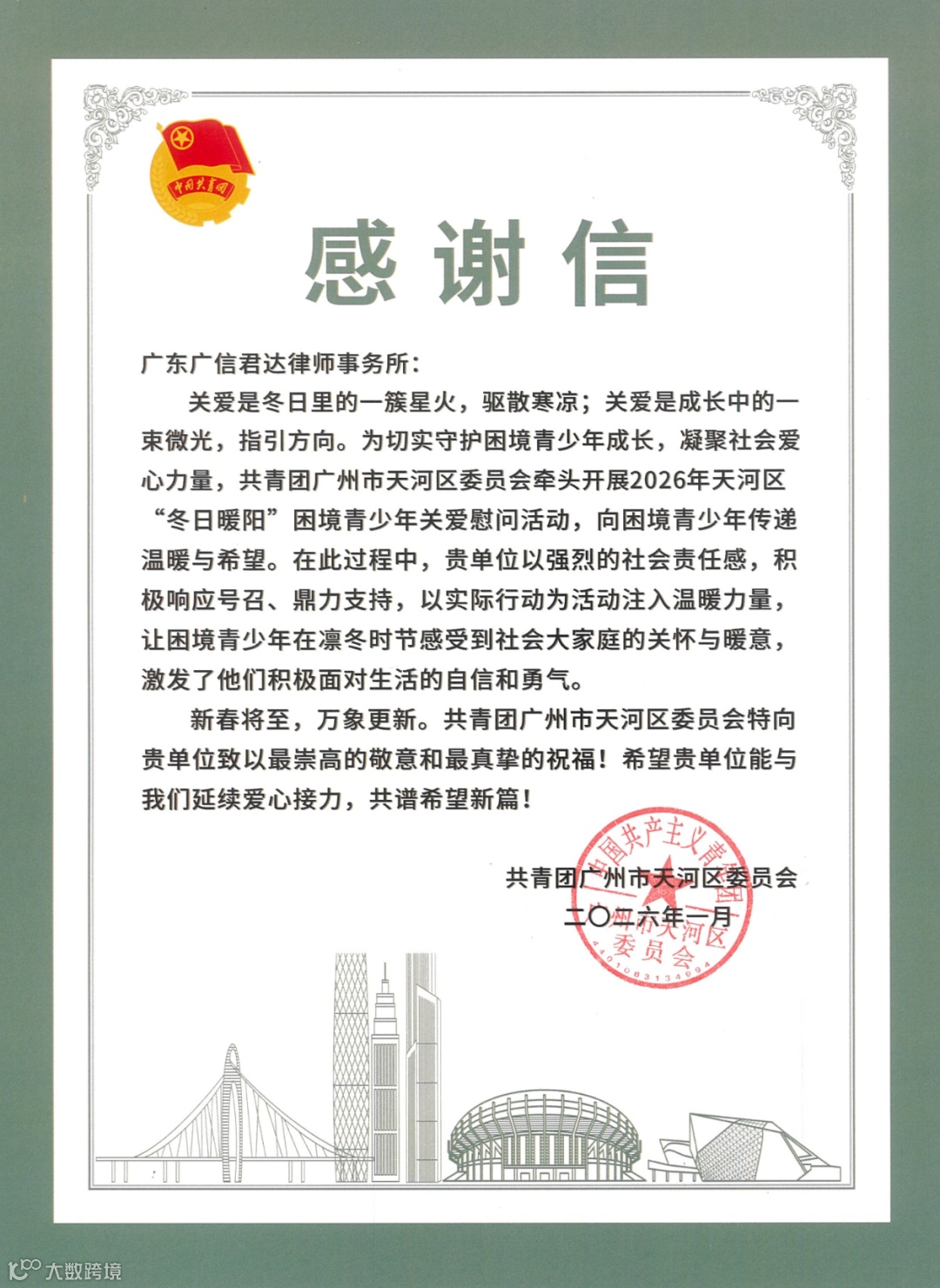 共青团广州市天河区委员会相关负责同志对我所的公益热情与社会责任感给予高度评价,并致以感谢信,期望未来继续携手同行,共同为青少年健康成长保驾护航。