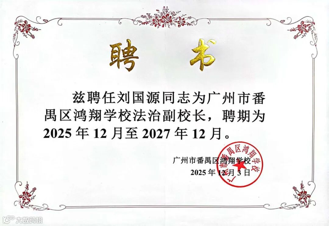 刘国源律师获聘为广州市番禺区鸿翔学校法治副校长