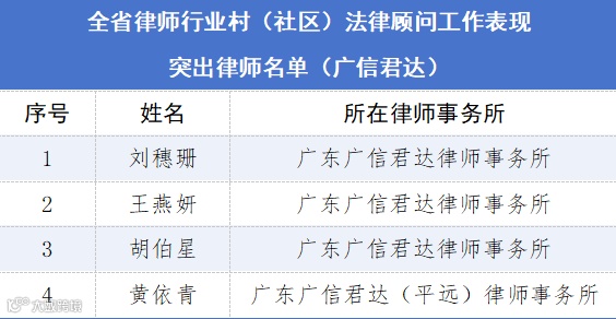 近日,广东省律师协会发布《关于通报表扬全省律师行业村(社区)法律顾问工作表现突出律师的决定》,广信君达律师事务所刘穗珊、王燕妍、胡伯星以及广信君达(平远)律师事务所黄依青律师四位同仁,凭借其在服务基层社会治理中的杰出表现和模范作用,荣获通报表扬。