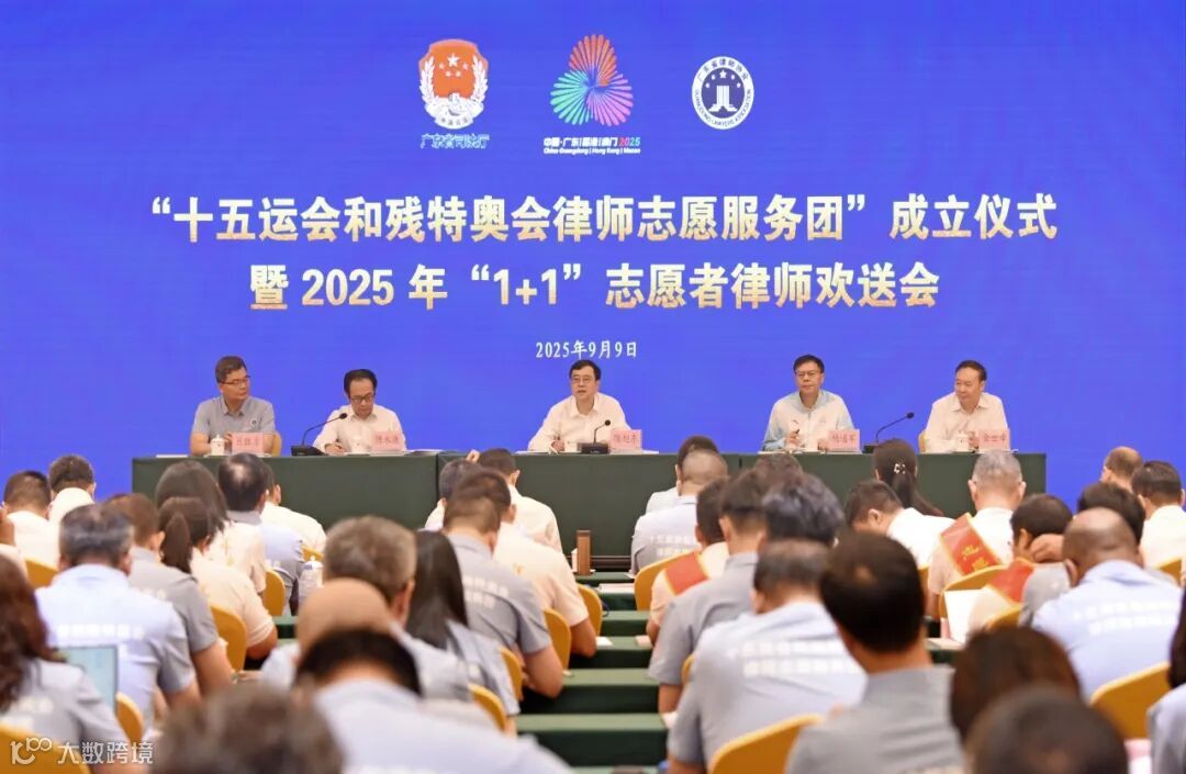 2025年9月9日,“十五运会和残特奥会律师志愿服务团”成立仪式在广州隆重举行。广东省司法厅党委书记、厅长陈旭东出席并讲话,省司法厅党委委员、副厅长陈永康主持仪式。会议听取了赛事法务工作及志愿服务团组建情况汇报,并举行授旗、颁证仪式。省律师协会会长肖胜方作为志愿服务团团长发言,十五运会广东赛区执委会办公室代表介绍赛事筹备进展。