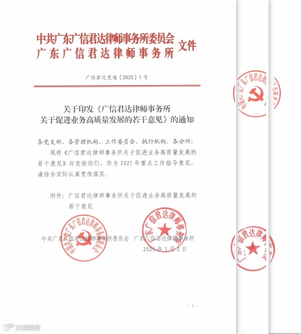 广信君达党委和事务所发布了今年1号文件——《广信君达律师事务所关于促进业务高质量发展的若干意见》