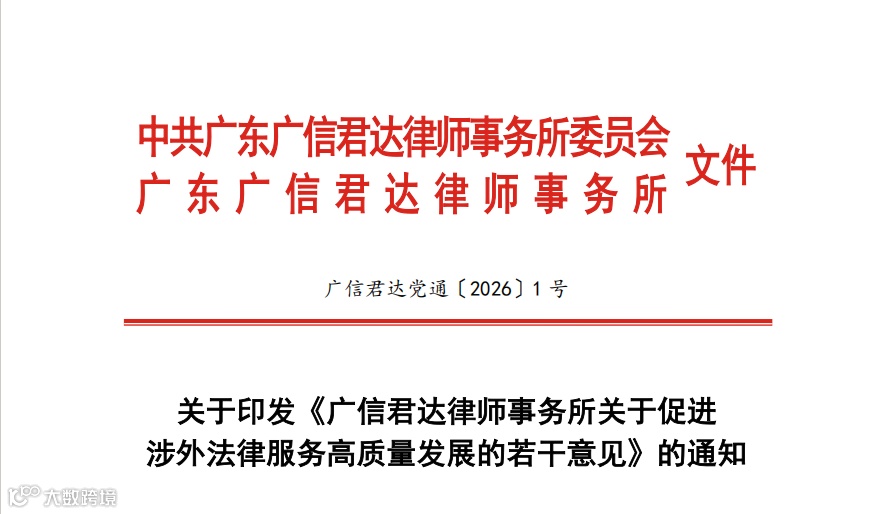 新年伊始,万象更新。2026年首个工作日,广信君达律师事务所党委和事务所联合发布了今年1号文件——《关于促进涉外法律服务高质量发展的若干意见》(以下简称“《意见》”)。《意见》立足新发展阶段,以高度的政治站位和强烈的使命担当,推出17项扎实举措,将“促进涉外法律服务高质量发展”确立为全所年度工作的重中之重,彰显了广信君达服务国家高水平对外开放大局、建设中国特色国际一流律师事务所的坚定决心与行动自觉。