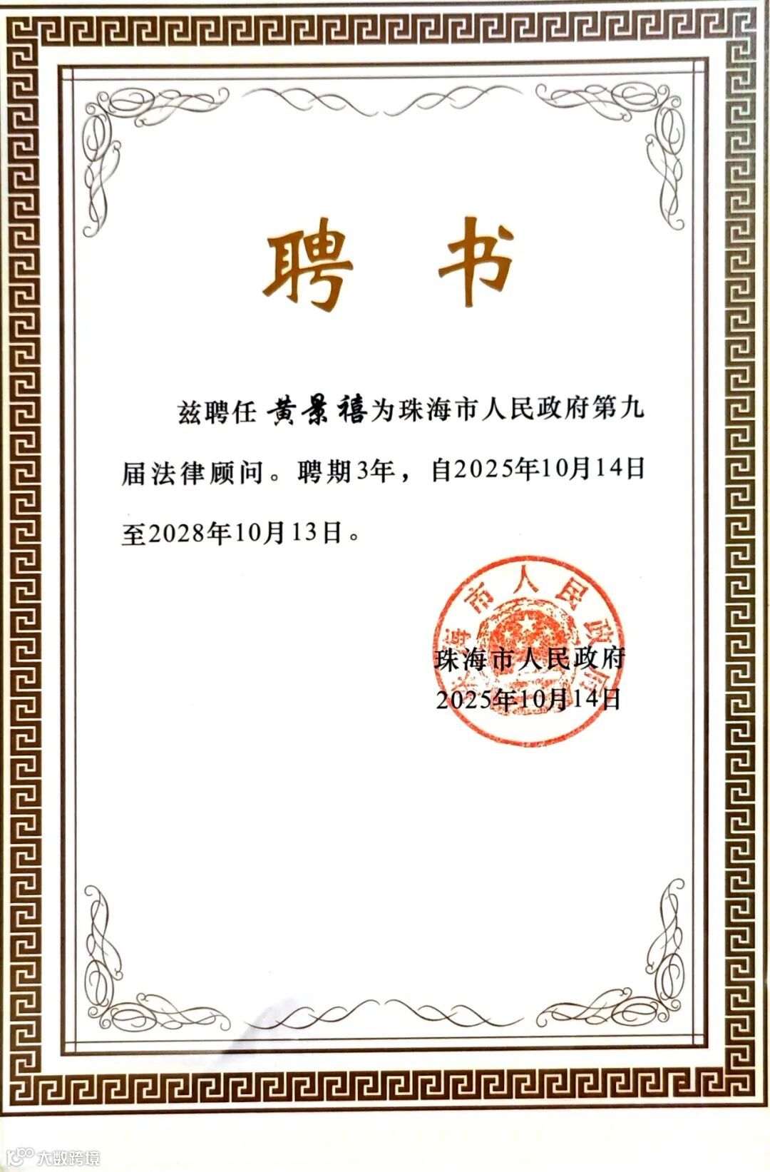 近日,珠海市人民政府举行第九届法律顾问聘任仪式,共聘任13位法律专家、律师为法律顾问。其中,广信君达律师事务所粤港澳大湾区律师黄景禧获聘为法律顾问。