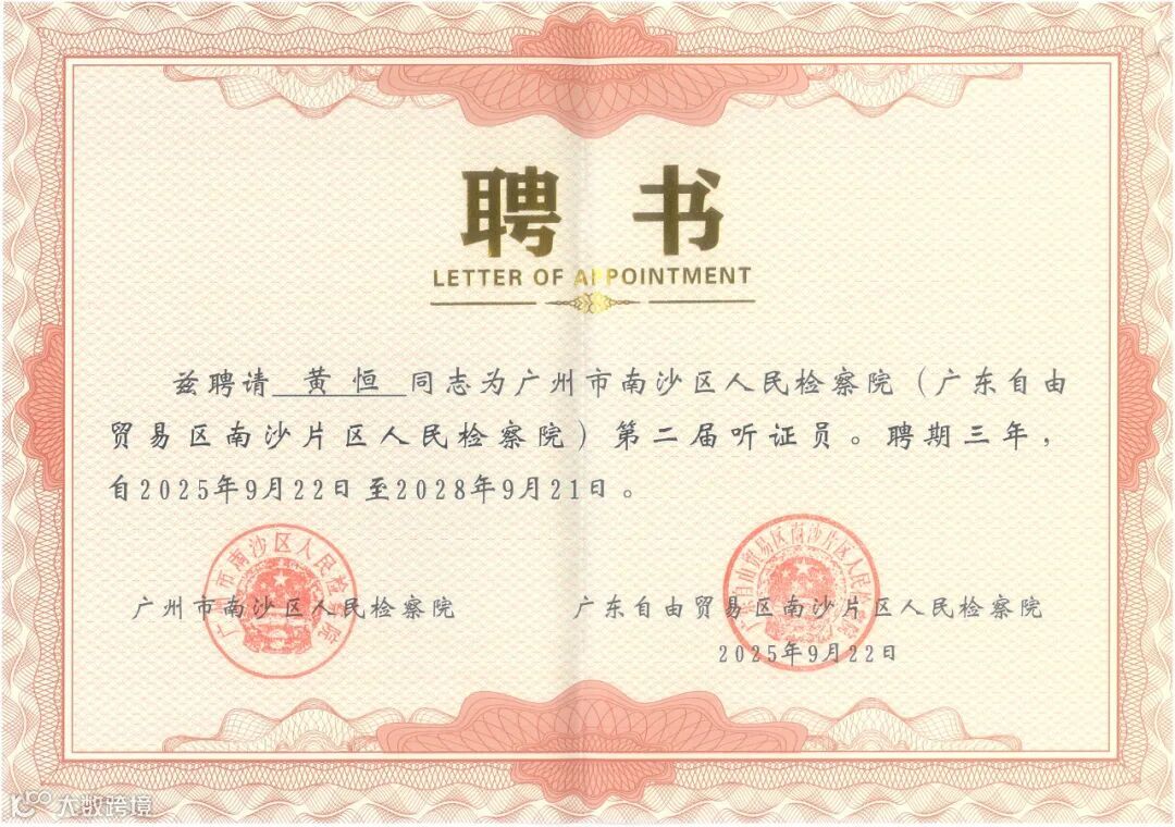 近日,广州市南沙区人民检察院(广东自由贸易区南沙片区人民检察院)经报名、组织推荐、资格审查、组织考察、公示等程序,正式完成第二届30名听证员的选任工作。其中,广信君达律师事务所合伙人黄恒律师获聘听证员,聘期三年。