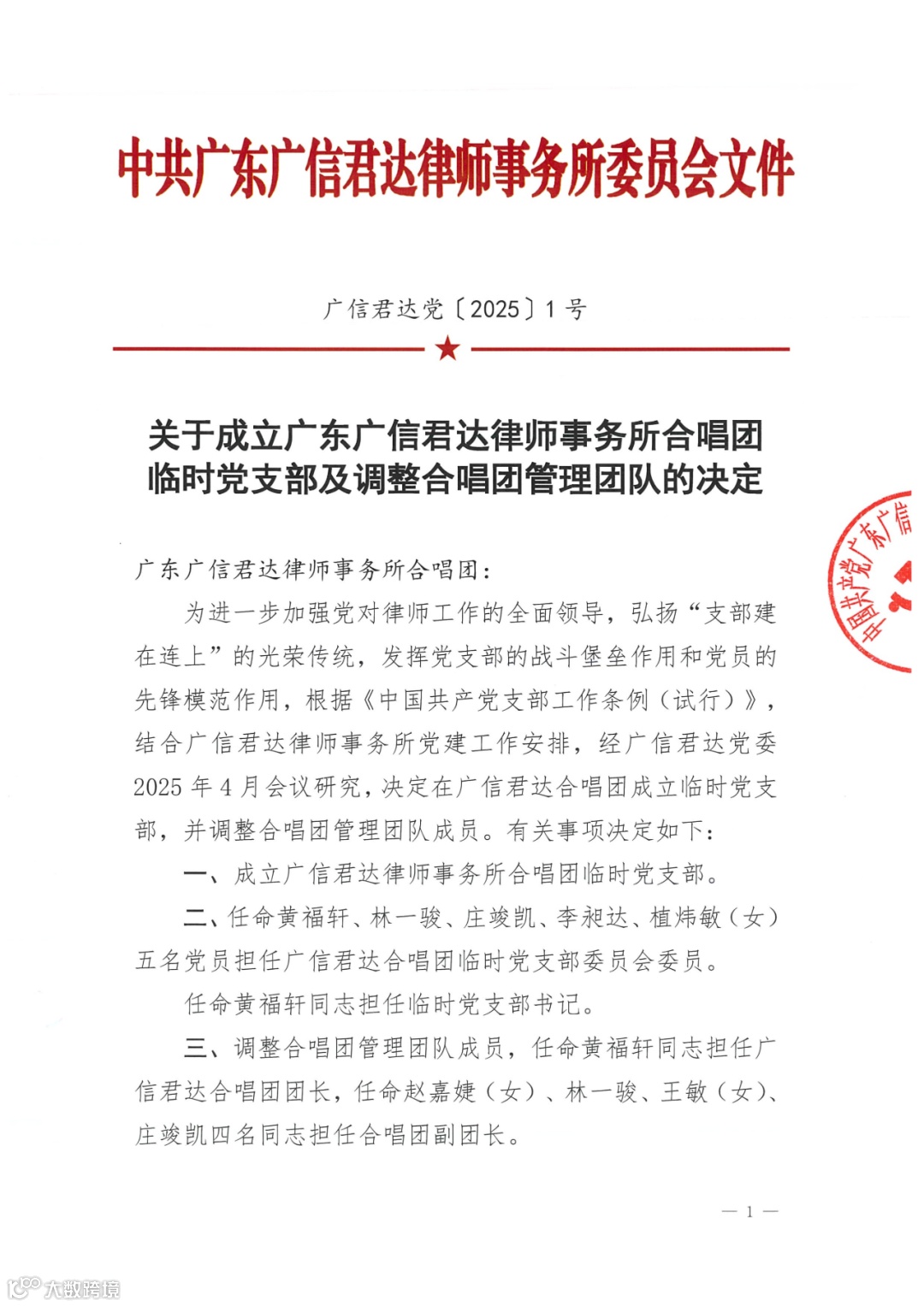作为一支始终坚持党建引领的队伍,广信君达党委高度重视合唱团的政治功能与组织建设。为确保各类对外展演的组织动员与演出质量的高标准,律所党委批准合唱团成立项目临时党支部。临时党支部由党委委员黄福轩、党委办公室主任林一骏等5名党员骨干组成,在排练和演出期间充分发挥战斗堡垒作用和党员的先锋模范作用,将严谨的组织纪律与饱满的政治热情注入到每一个音符之中,确保每次演出排练高质量地完成,积极创先争优。