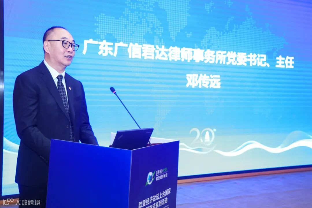 广信君达主任邓传远律师在致辞中表示,欧亚经济论坛是连接中外、促进区域合作的重要平台,上合国家经贸交流更是推动“一带一路”倡议落地、助力地方经济“双循环”的关键纽带。他指出,当前全球经贸格局正经历深刻变革,产业融合与跨境合作成为破局关键。经贸合作的顺利开展,离不开坚实的法治保障,广信君达作为扎根粤港澳大湾区、服务辐射全国及“一带一路”沿线国家的大型综合性律师事务所,将积极发挥专业优势,为丝路经济带跨境经贸高质量发展贡献力量。