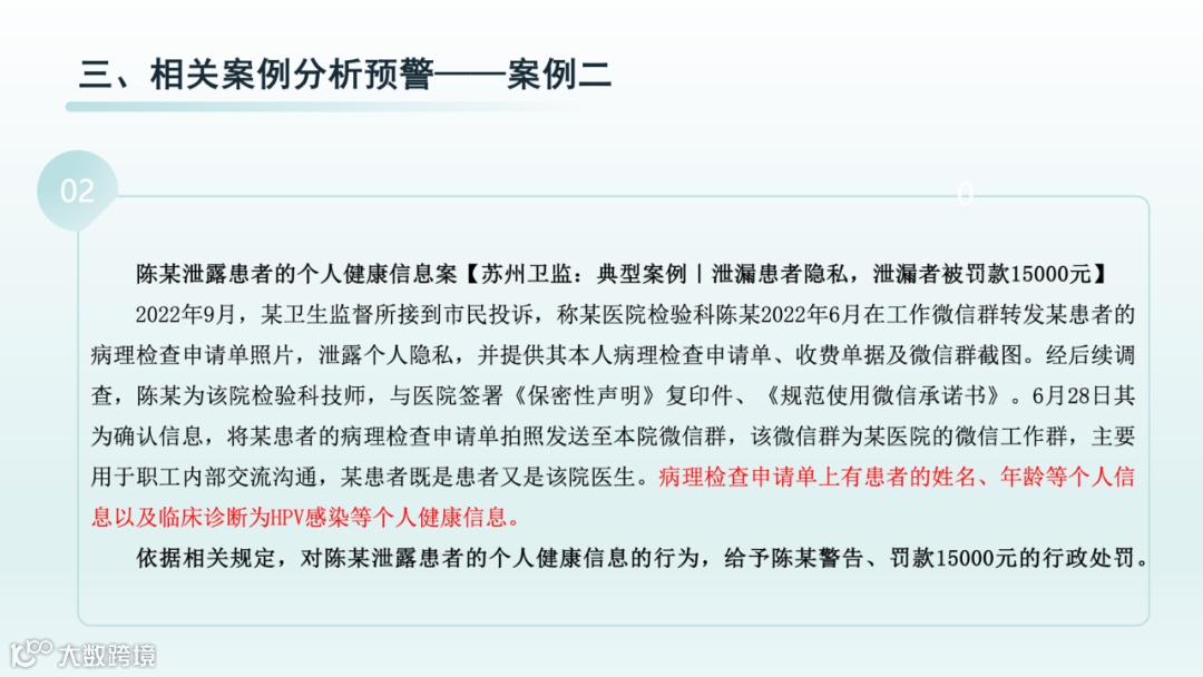 许文滔律师结合相关法律法规与典型案例,深入剖析了医疗隐私泄露的法律后果。他指出,患者隐私不仅包括姓名、身份证号等身份信息,还涵盖病历、检验数据、基因信息等医疗信息,甚至诊疗过程中的身体隐私也同样需要保护。他强调,从刑事追责到民事赔偿,医疗隐私泄露的法律风险贯穿于信息处理的全链条,医疗机构务必高度重视、严加防范。此外,许文滔律师还从信息管理、诊疗流程、人员培训等多个维度,为医疗机构提供具有可操作性的合规建议。