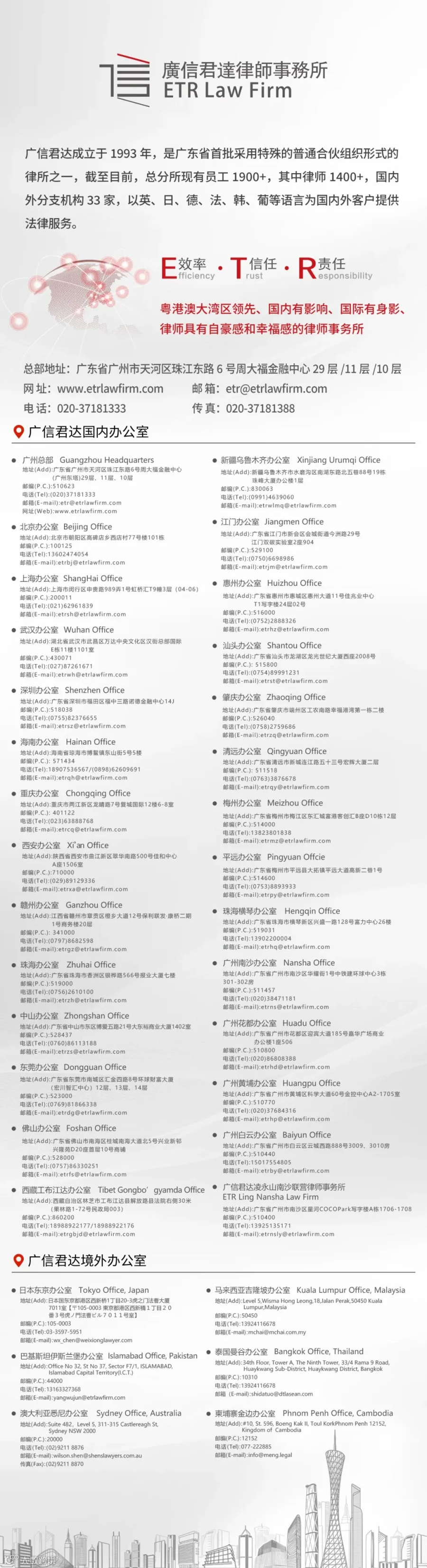 广信君达是广东省首批涉外律师事务所库单位,“一带一路”律师联盟首批成员单位,“一带一路”十佳律师事务所,总部位于广州天河,在北京、上海、深圳、武汉、重庆、西安、海南、江西、珠海、佛山、惠州、汕头、东莞、中山、江门、西藏林芝工布江达、新疆乌鲁木齐等地及美国、日本、巴基斯坦、澳大利亚、马来西亚、泰国、柬埔寨等国家设有33家境内外办公室,以汉、英、日、德、法、韩语及葡萄牙语、缅甸语、越南语等为境内外客户提供优质法律服务。