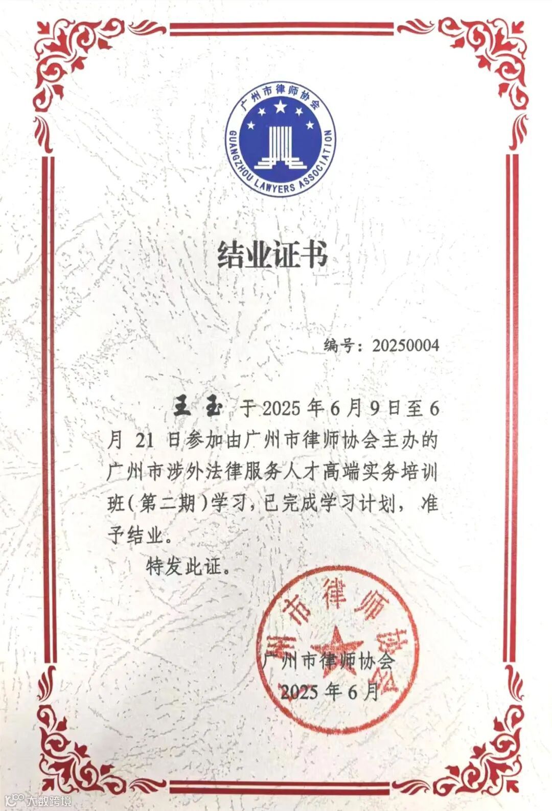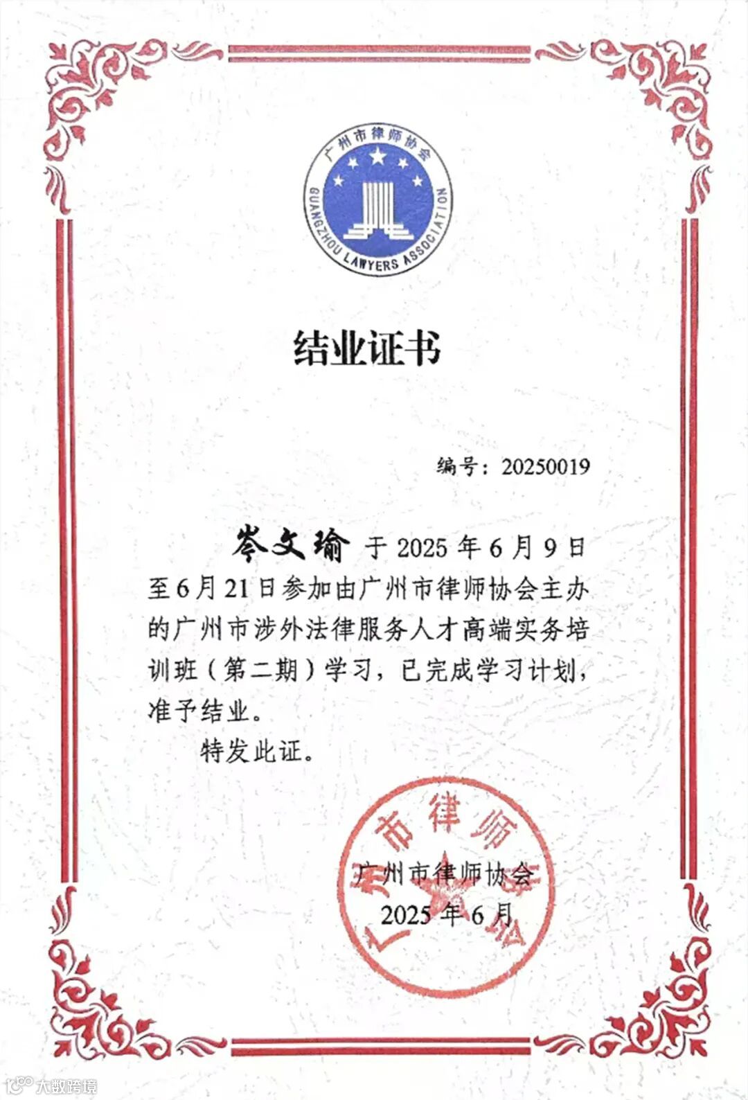 近日,广州市涉外法律服务人才高端实务培训班(第二期)结业仪式顺利举行。本次培训由广州市司法局指导,市律师协会主办,市律师协会涉外法律服务分会、暨南大学法学院以及市律兴律师业务发展研究院承办,是市司法局与泰国皇家律师协会深化合作、落实双边共识的务实举措,旨在搭建中泰法律服务的合作桥梁。培训共遴选40名优秀涉外律师学员开展案例教学与考察交流,广信君达律师事务所合伙人岑文瑜律师、专职律师冯丽娟、罗允齐、徐晓杰、王玉参加培训并顺利结业。