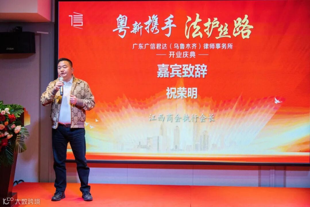 祝荣明执行会长代表新疆江西商会致辞。他首先对乌鲁木齐分所的成立表示热烈祝贺,他表示,作为乌鲁木齐分所的长期合作伙伴,他深切感受到这家律所不仅是一家法律服务机构,更是值得托付的战略伙伴。双方在涉外法律、企业合规、投资贸易等领域深度协作,新疆作为丝绸之路经济带核心区,正需要这样具备国际化视野和专业能力的律所,为企业和政府提供高质量法律服务。