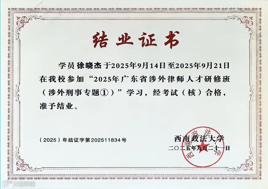 为切实提升律师在涉外刑事领域的专业素养与实操能力,近日,由广东省司法厅、广东省律师协会主办,西南政法大学承办的2025年广东省涉外律师人才涉外刑事专题研修班(涉外刑事专题①)在重庆举行。100名来自广东省的律师参与此次培训,其中,广信君达律师事务所翁乔中、徐晓杰律师参训并顺利结业。