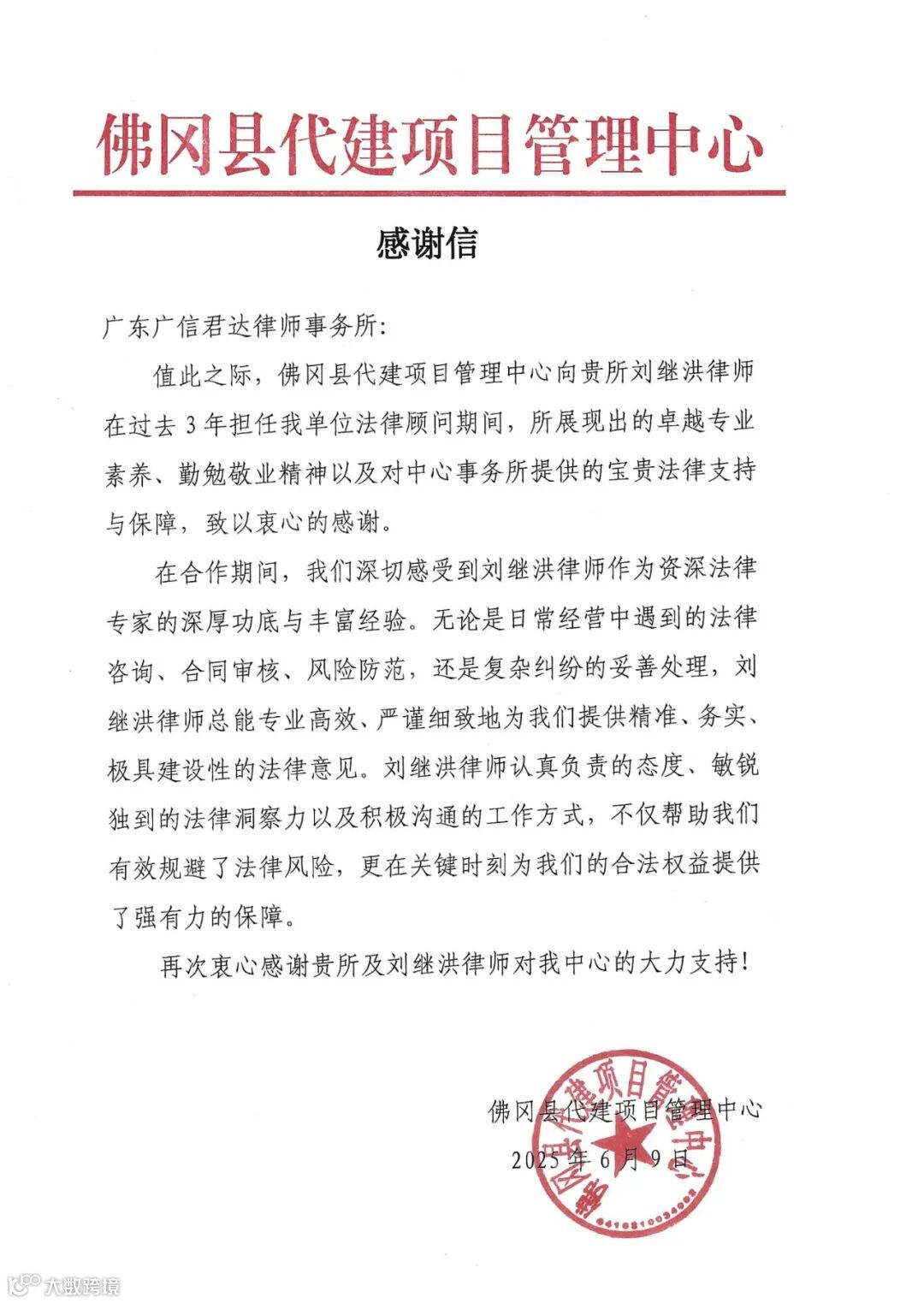 近日,清远市佛冈县代建项目管理中心向广信君达律师事务所发来感谢信,信中对广信君达及刘继洪律师提供的常年法律顾问服务工作表示高度认可。