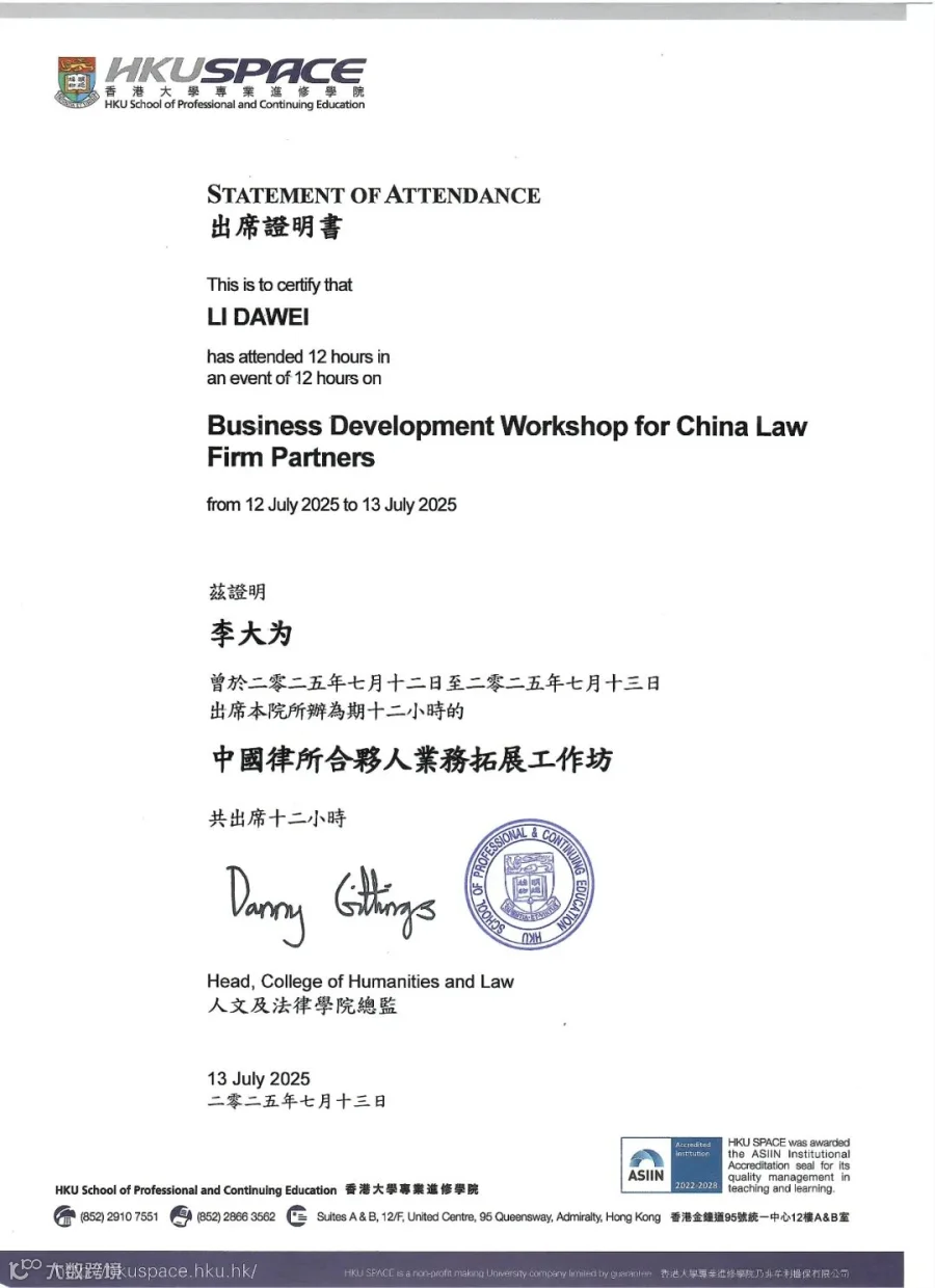 2025年7月11日至13日,广信君达律师事务所君行团队李大为律师参加在香港大学举行的中国律师出海领航班(香港站)涉外业务培训活动,此次律师涉外业务培训由智合组织举办,吸引了来自中国内地多个律师事务所的近50名律师学员参加。经学习,李大为律师获香港大学颁发的涉外业务培训证书。