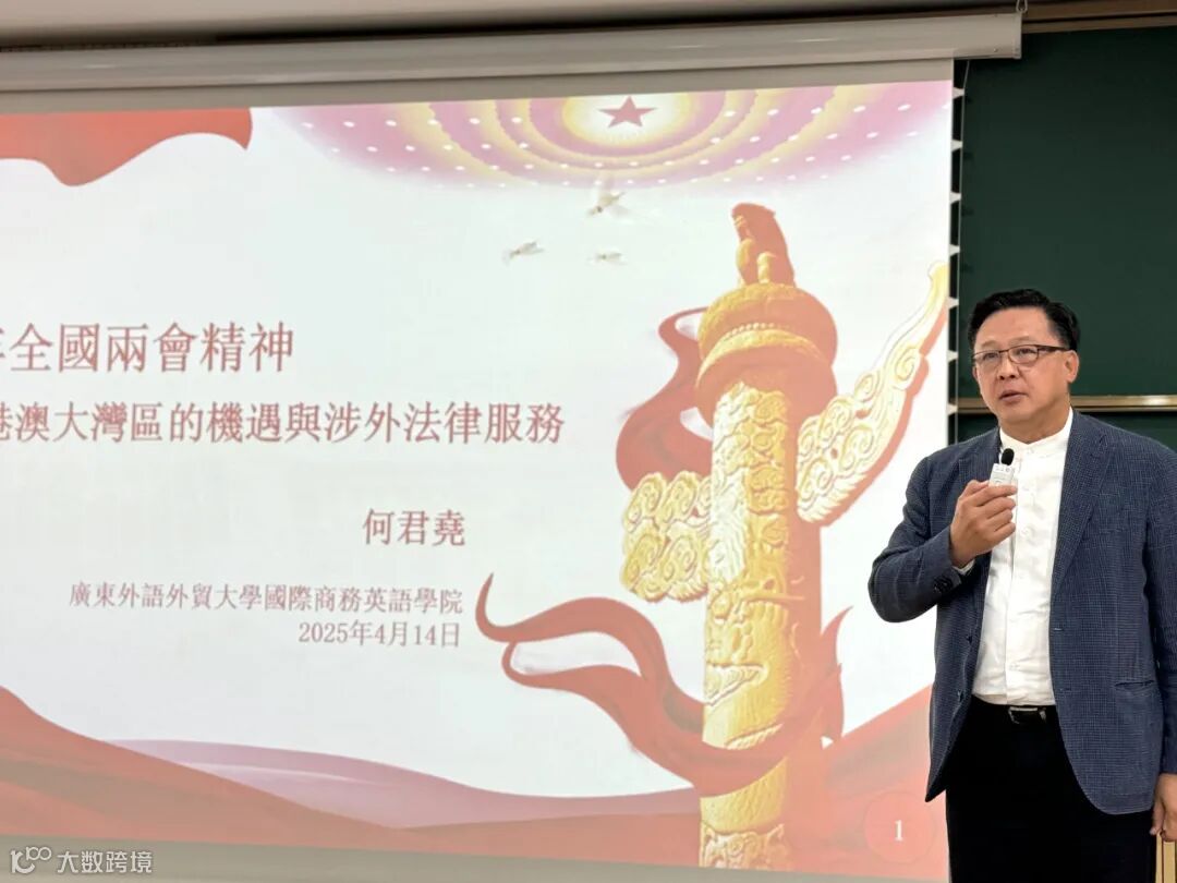 近日,广信君达律师事务所粤港澳大湾区律师何君尧受邀为广东外语外贸大学(下称“广外”)商英学院师生开展“2025年全国两会精神——关于粤港澳大湾区的机遇与涉外法律服务”专题讲座。广外副校长谢伟光,国际公益法律服务协会秘书长吴毅荣、行政主任潘锦洋等出席活动,商英学院领导班子以及师生代表近200人参加讲座。活动由商英学院党委书记苏冬燕主持。