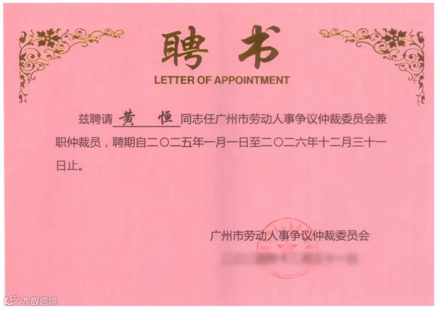 近期,广信君达律师事务所高级合伙人朱滔律师、合伙人黄恒律师再次续聘为广州市劳动人事争议仲裁委员会兼职仲裁员,聘期自2025年1月1日至2026年12月31日。