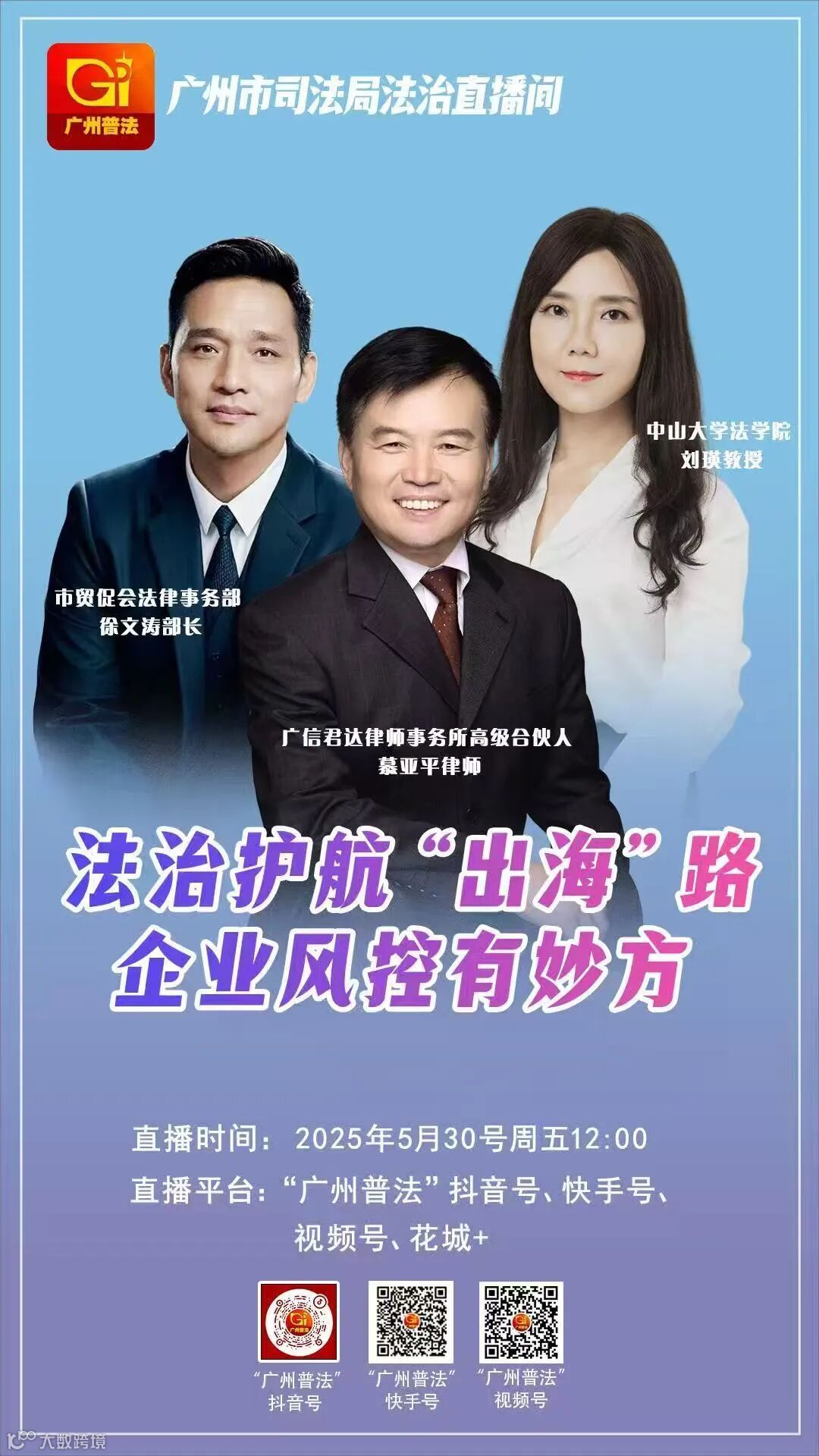 近日,广信君达律师事务所高级合伙人慕亚平律师受邀参加由广州市依法治市办、广州市司法局、广州电视台联合打造的“法治直播间”栏目,与中山大学法学院教授刘瑛、广州市贸促会法律事务部部长徐文涛共同聚焦“法治护航出海路 企业风控有妙方”主题,聚焦中国企业海外投资全流程法律风险,为企业“走出去”提供专业法律风控指引。