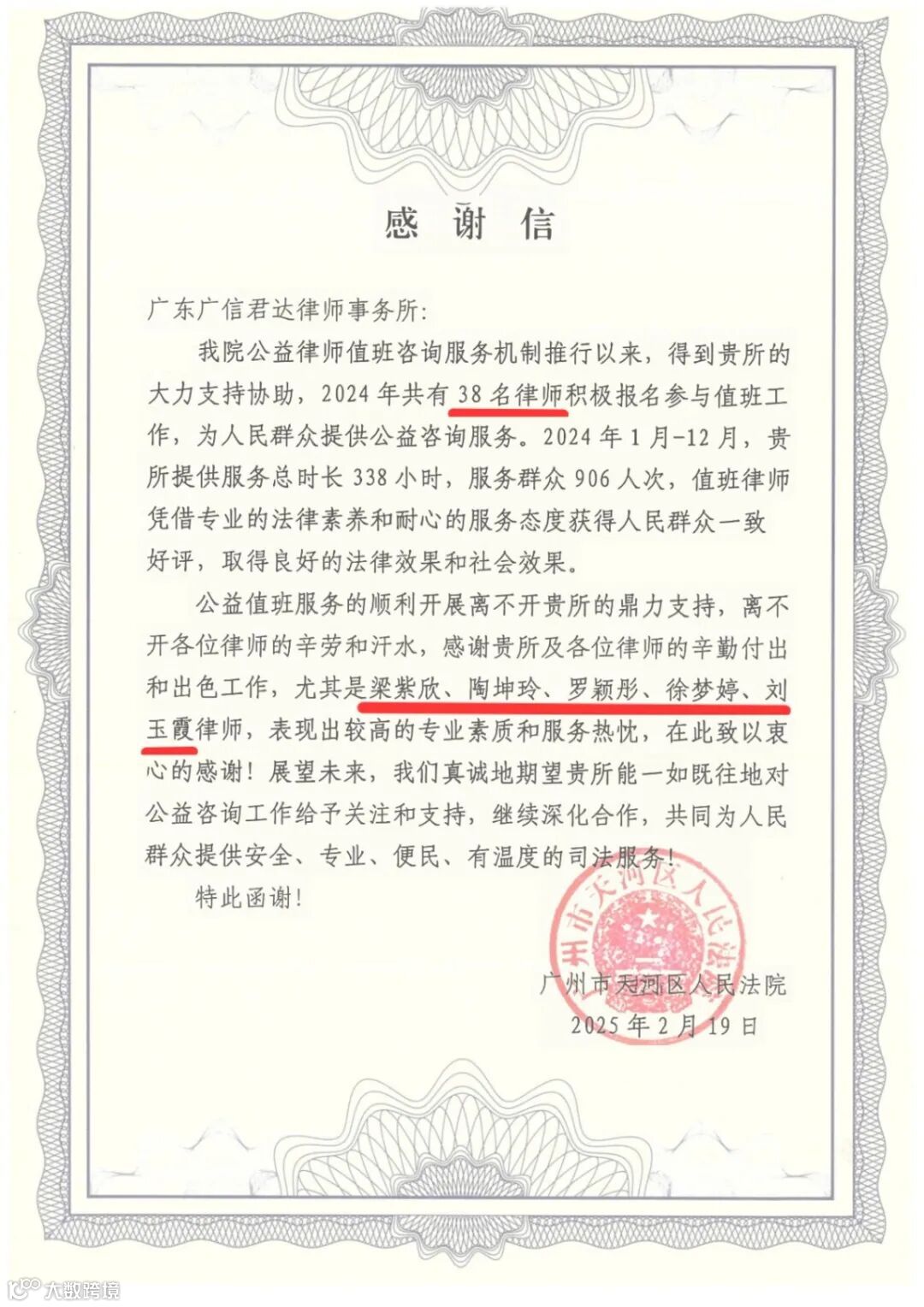 简讯 | 广信君达及38名律师获天河区法院感谢信