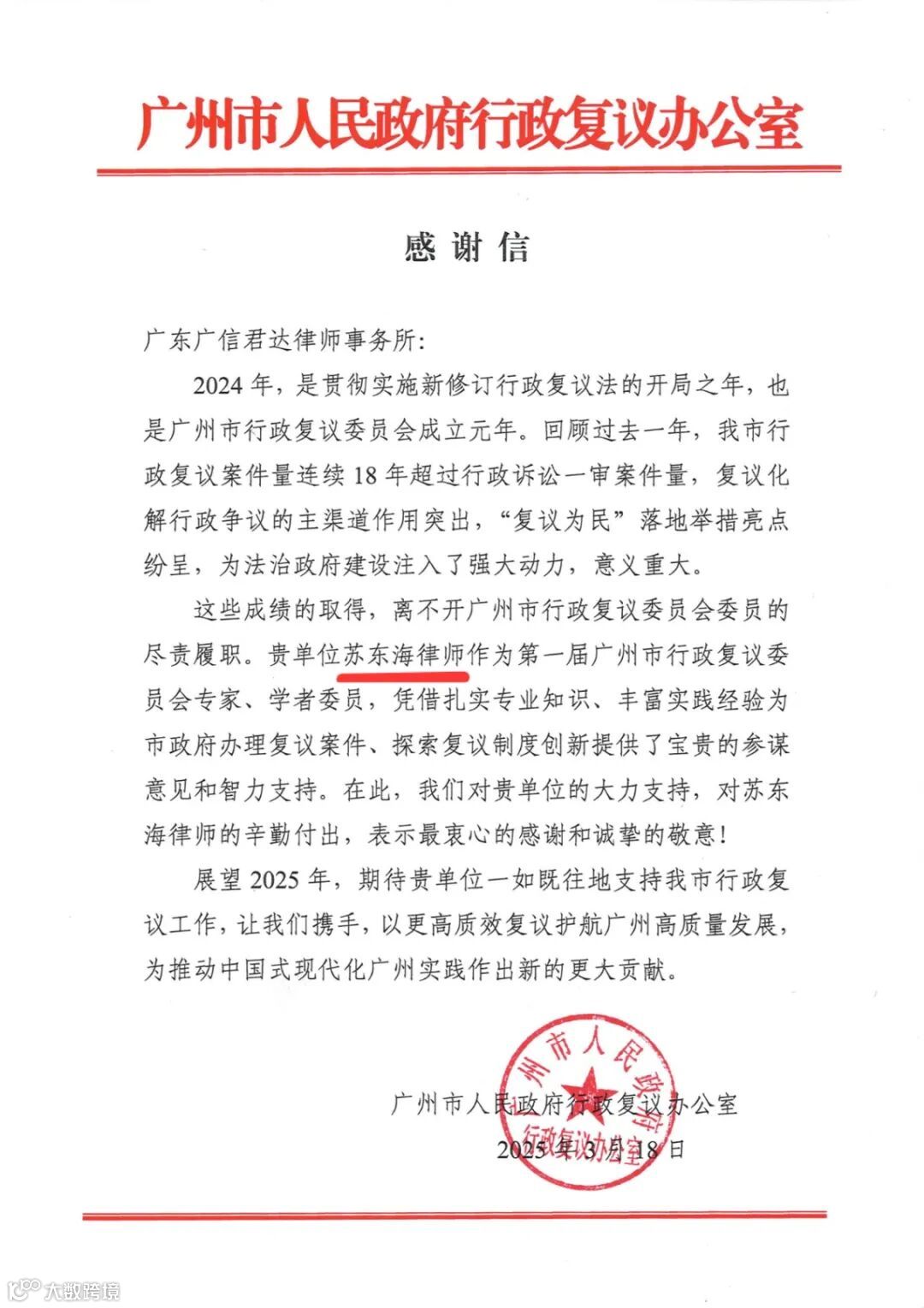 简讯 | 广信君达获广州市人民政府行政复议办公室感谢信